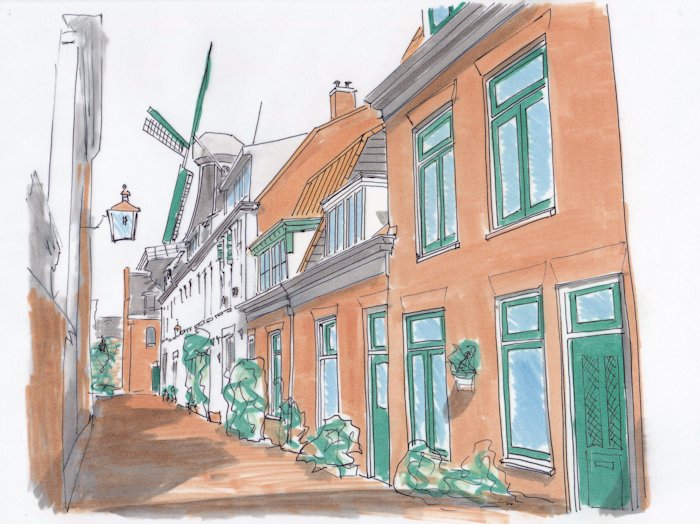 Aan de Papentorenvest in Haarlem is een dakopbouw gerealiseerd op een bijzondere locatie aan het Spaarne. De opbouw in het nauwe straatje is aan de voorzijde nauwelijks te ervaren, omdat de bestaande goot is gehandhaafd en de dakhelling alleen iets steiler is gemaakt en met dezelfde oranje keramische pannen is doorgezet op de 2e verdieping. De materialisatie aan de zij- en achtergevel is dezelfde zwarte gepotdekselde delen als van de molen de Adriaan, maar dan horizontaal toegepast. De buren zullen, als zij ook willen uitbreiden, dezelfde architectuur moeten overnemen, omdat de twee woningen als een ensemble bij de gemeente worden gezien. Hier hebben zij gelukkig geen bezwaar tegen.